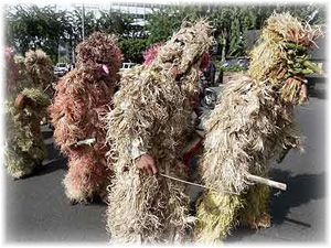 Als Waldgeister verkleidete Indonesier tanzen als Protest gegen die Abholzung der Regenwälder. Die Regenwälder sind die grüne Lunge dieser Erde! Je mehr Wälder dem Feuer zum Opfer fallen, um so mehr CO2(Kohlendioxid) wird freigesetzt!
